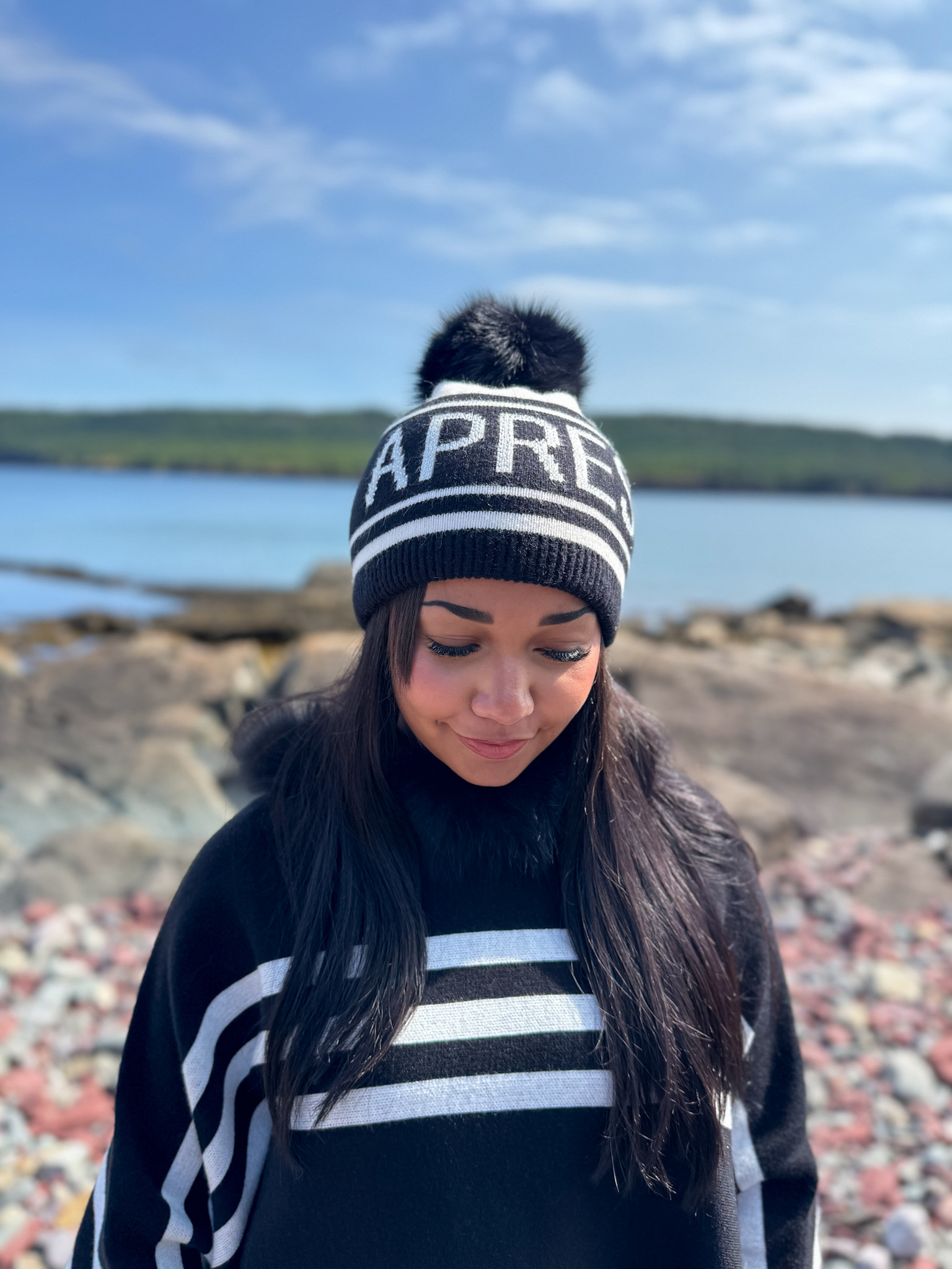 The Apres Ski Hat features a soft knit design topped with a real fox fur pom, giving it the perfect blend of warmth, comfort, and winter luxury. Cozy and stylish, it is the ideal accessory for cold weather days on and off the slopes.