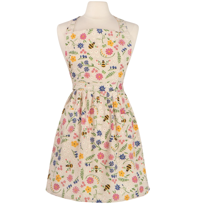 A classic silhouette brings a farmhouse feel to the figure with the Classic Bee Garden apron. A defined waist with pleats adds dainty charm, while recipe cards can be tucked away in two front pockets. Our Bee Garden collection pays tribute to nature's essential helpers. With folk art-inspired designs featuring bees buzzing among the wildflowers, this cheerful apron brings garden-fresh delight to your space. Symmetry highlights the natural harmony of pollinators and plants.