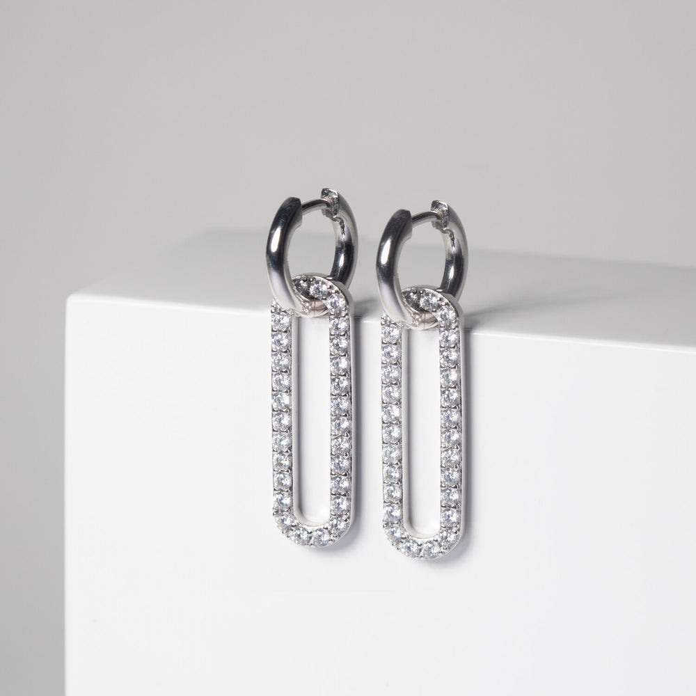 Earrings made of 18k gold plated 925 Sterling silver or 925 Sterling silver with rhodium, polished surface, and handset with facet cut white zirconia.Earrings measurements: Diameter 13 mm, Length 36 mm, width 8 mm, thickness 2 mm