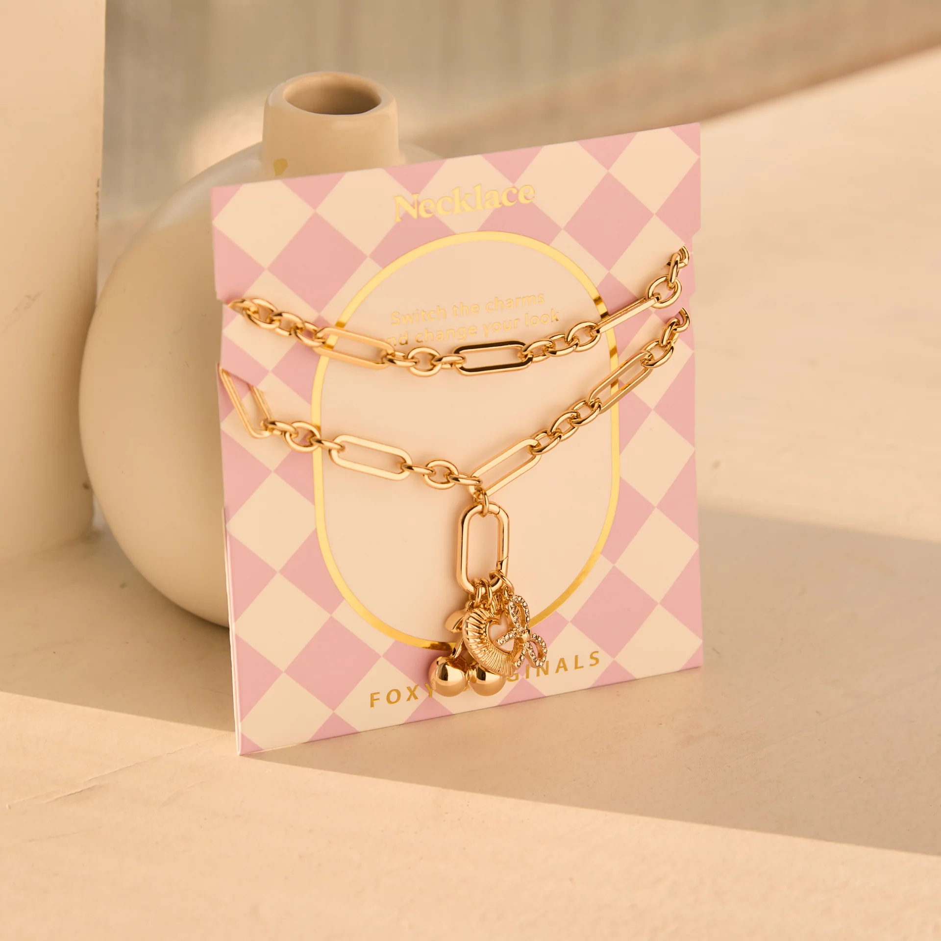 • A long, versatile chain makes the Cheri Necklace your new go-to. Wrapped or long, this charm necklace showcases a cherry charm, a pavet bow, and heart charm with mother of pearl inlay. Available in Gold and Silver.