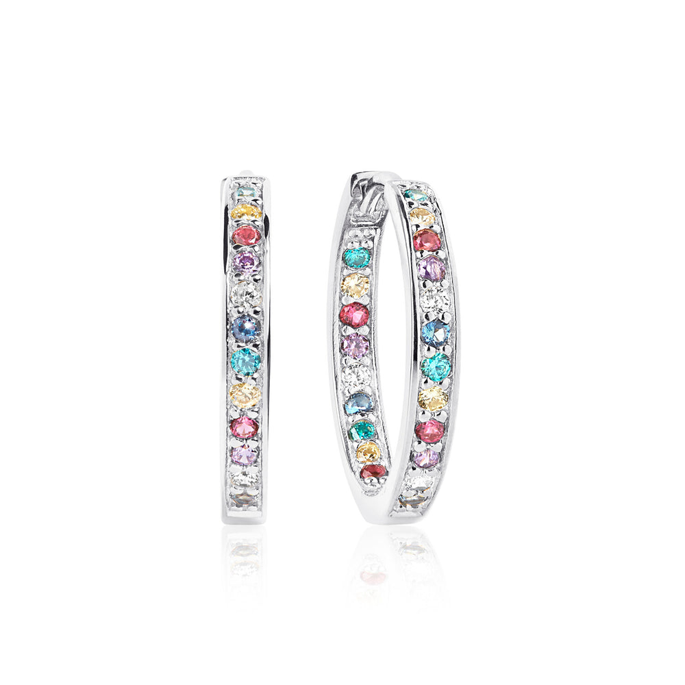 Earrings made of 925 Sterling silver, polished surface and facet cut multicoloured zirconia.Earrings measurements: Diameter 17 mm