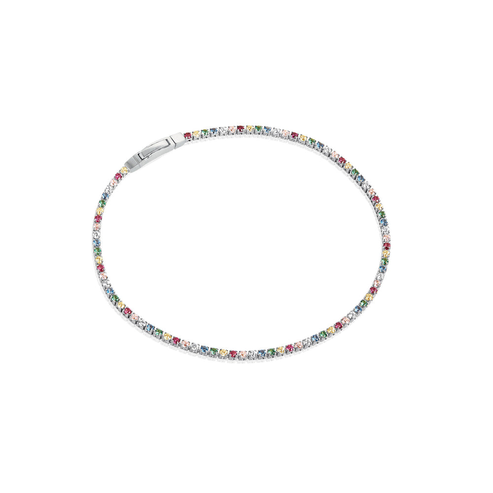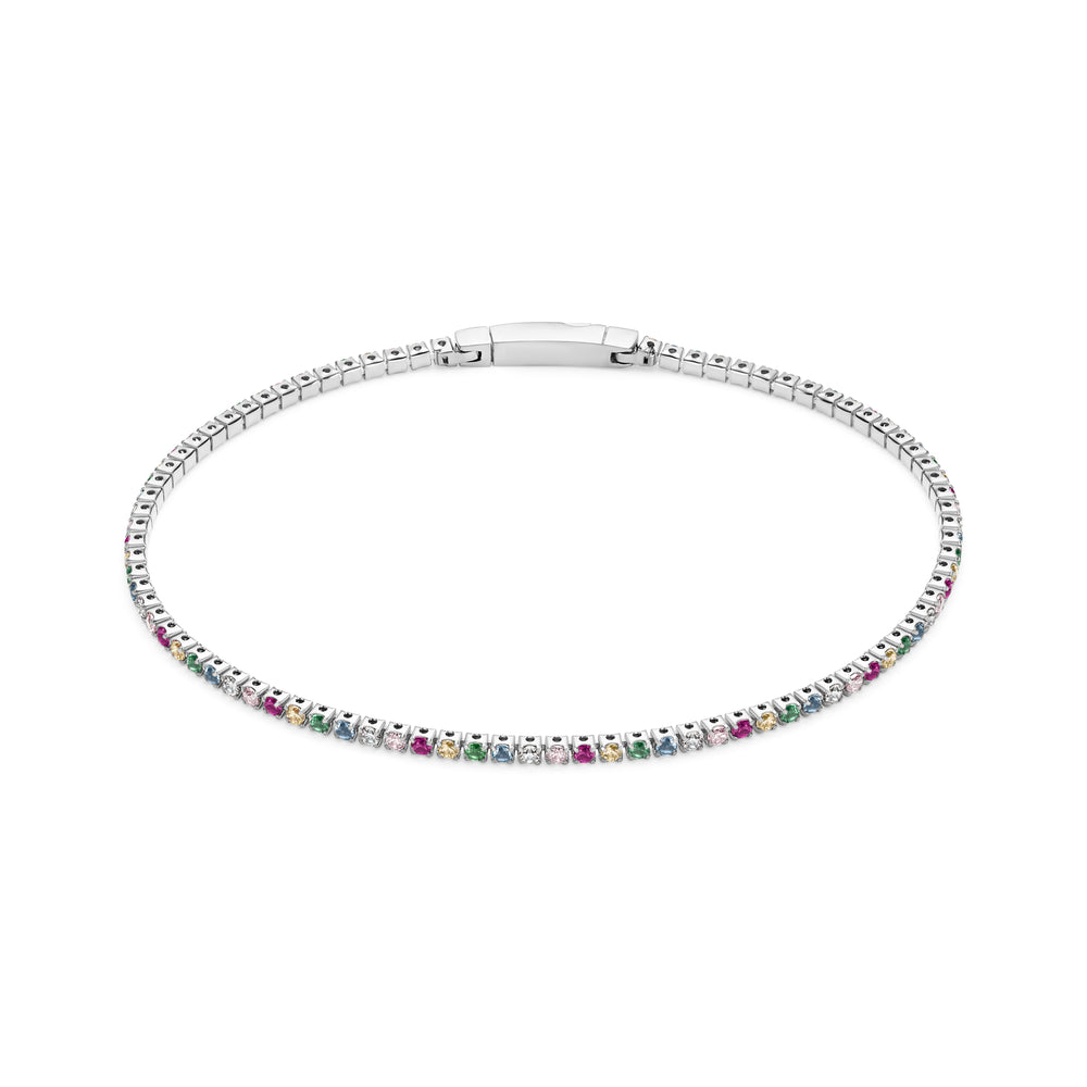 Bracelet made of 925 Sterling silver with rhodium, polished surface and facet cut multicoloured zirconia.Bracelet measurements: Chain length incl. lock 17 cm