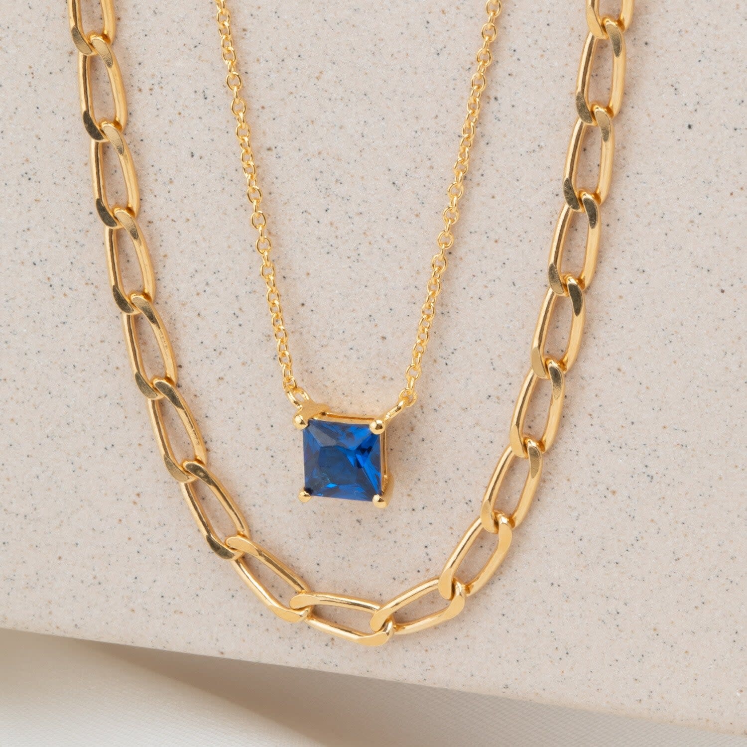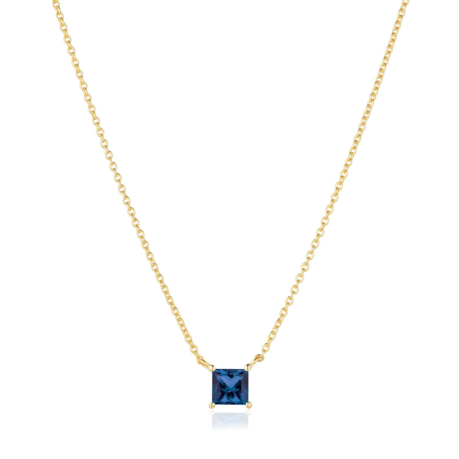 Necklace made of 18 karat gold plated 925 Sterling silver or 925 Sterling silver with rhodium, polished surface, and hand set with facet cut blue zirconia.