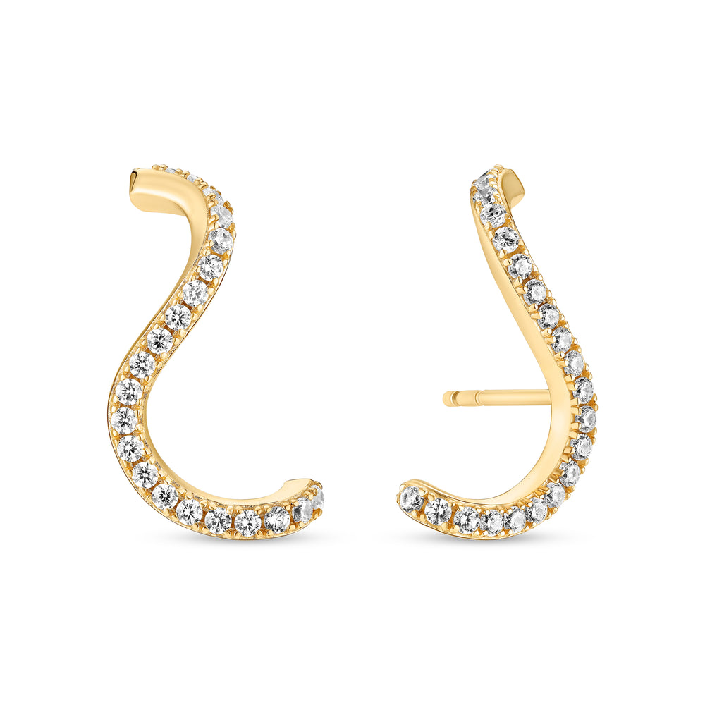 • Earrings made of 18 karat gold plated 925 Sterling Silver or rhodium plated 925 Sterling Silver, a polished surface, and handset with facet cut white zirconia