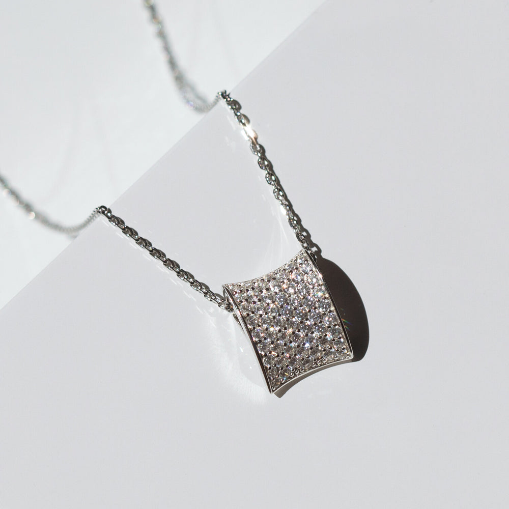 Pendant made of 925 Sterling Silver with rhodium, polished surface, and handset with facet cut white zirconia or facet cut gradient tones of blue and white zirconia.