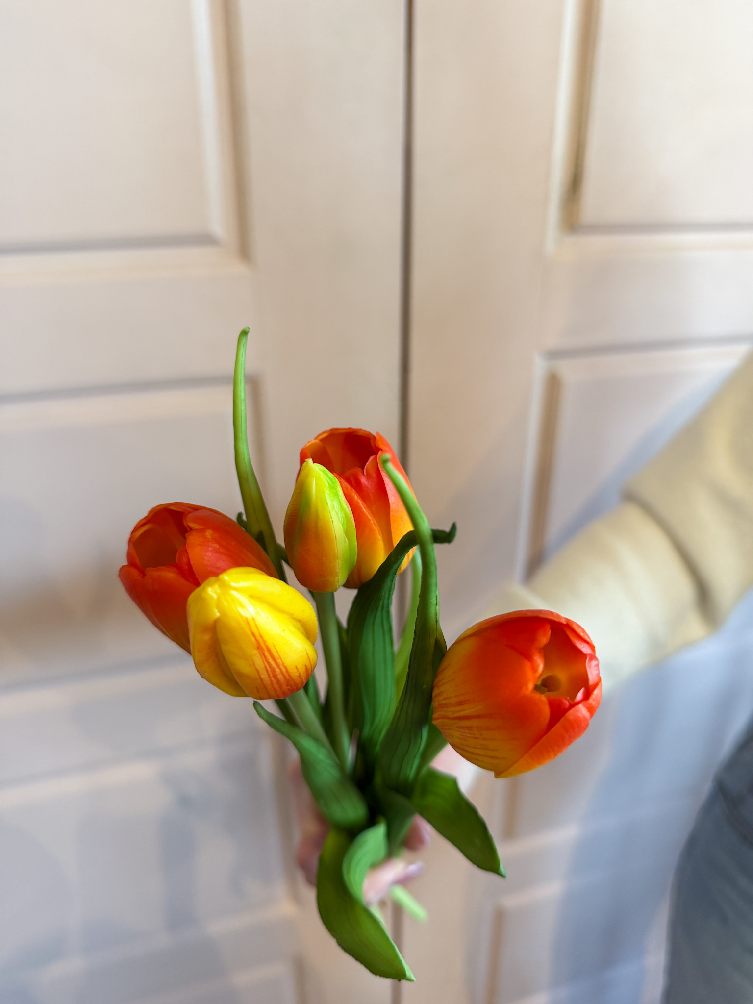 • A soft, lifelike bundle with classic tulip blooms, featuring three flowers and two buds.