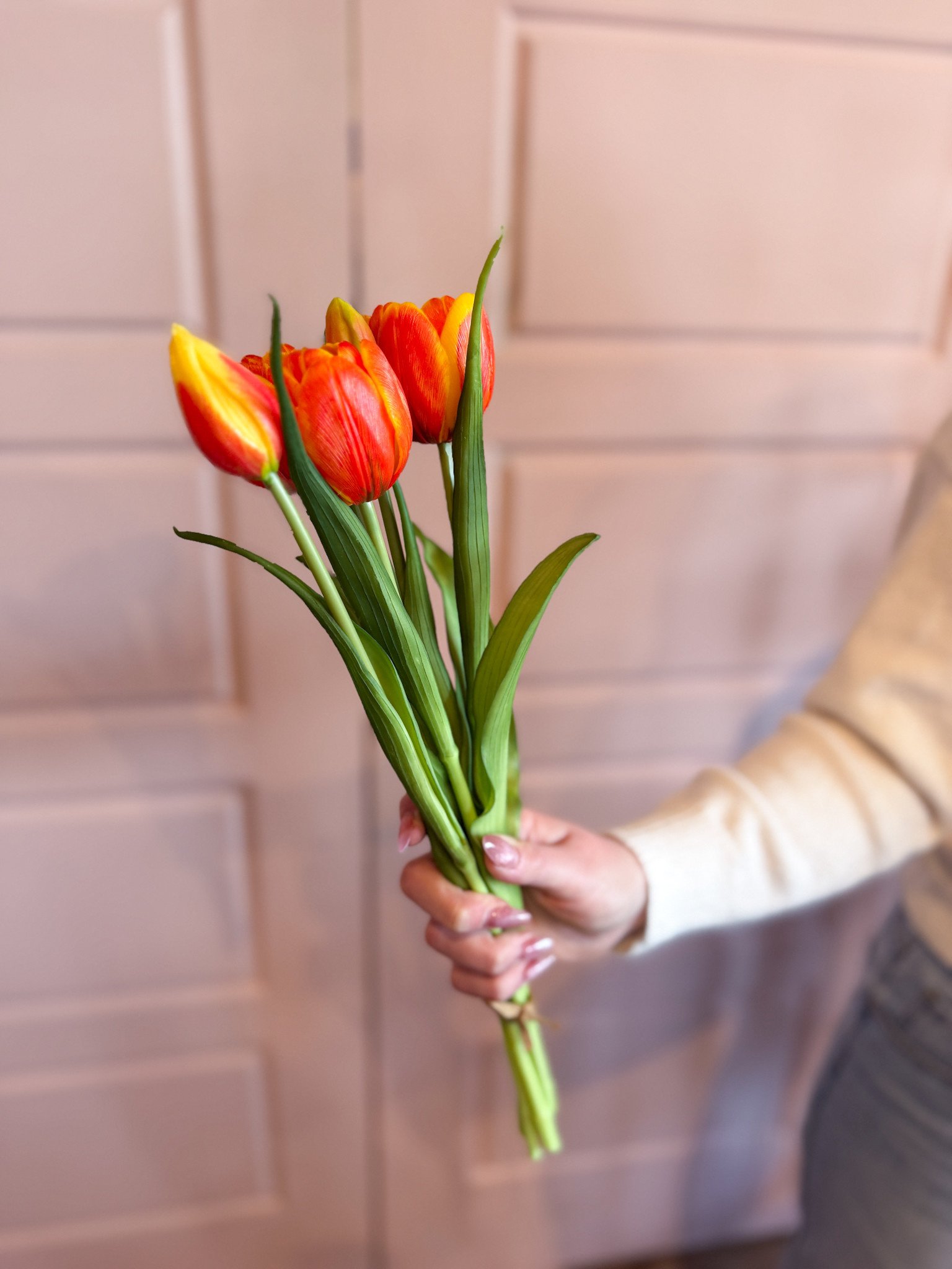 • A soft, lifelike bundle with full, layered blooms, featuring three flowers and two buds.
