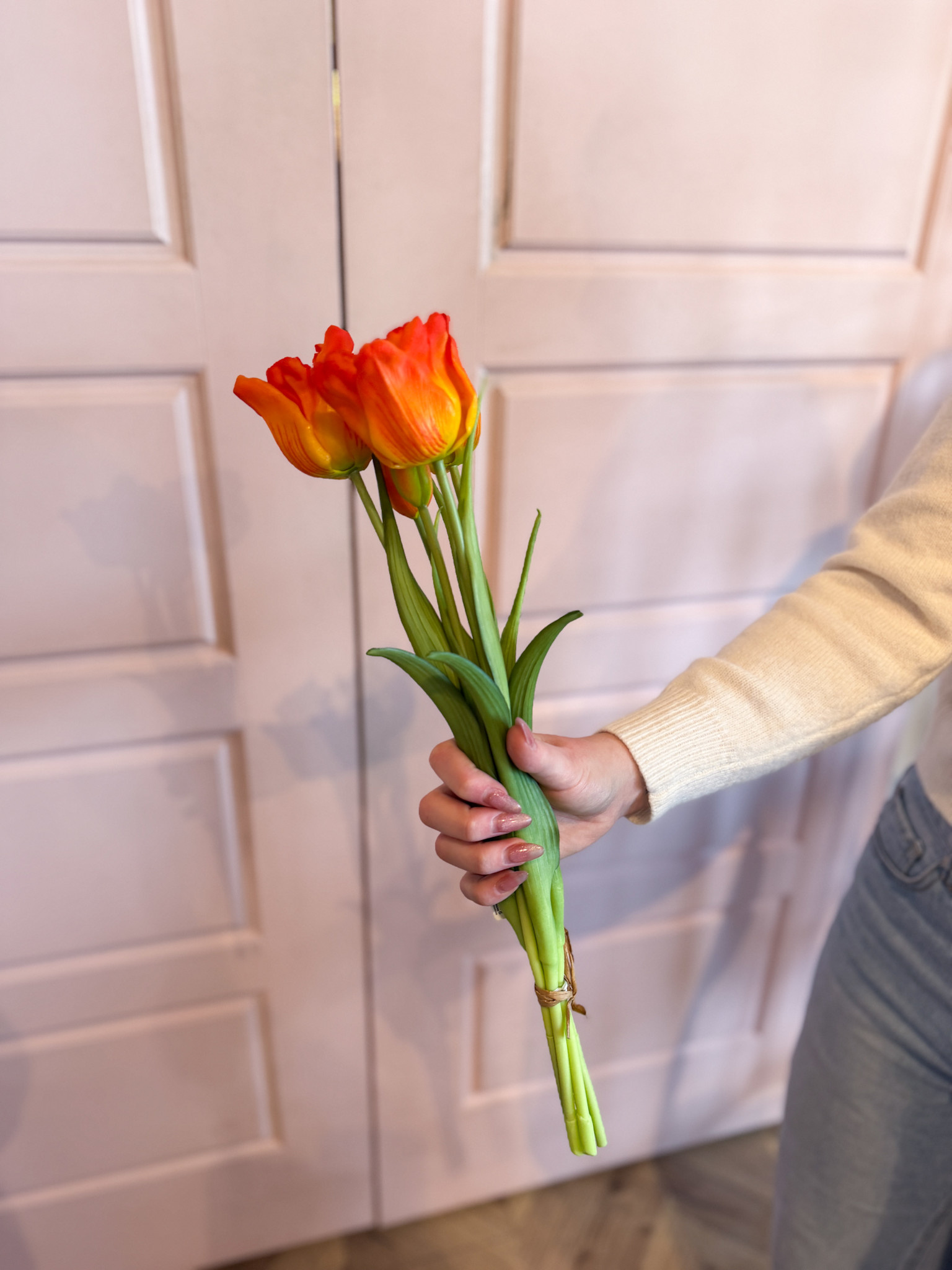 • A soft, lifelike bundle with beautifully ruffled petals, featuring three full blooms and two buds.