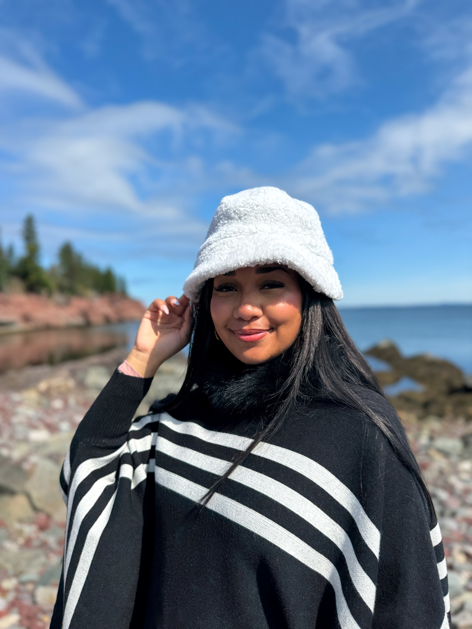 The Ivory Lambswool Bucket Hat; a stylish and cozy accessory that brings together fashion and comfort effortlessly. Whether you're strolling through the city, enjoying a day at the beach, or simply looking for a chic addition to your outfit, this bucket hat is the perfect choice.