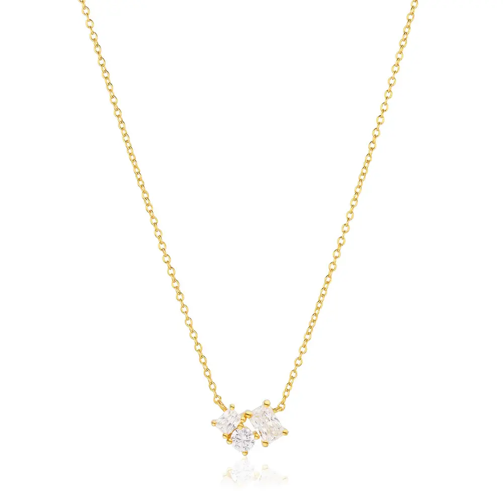 Necklace made of 18 karat gold plated 925 Sterling silver, polished surface, and handset with white/multicoloured facet cut and emerald cut zirconia.