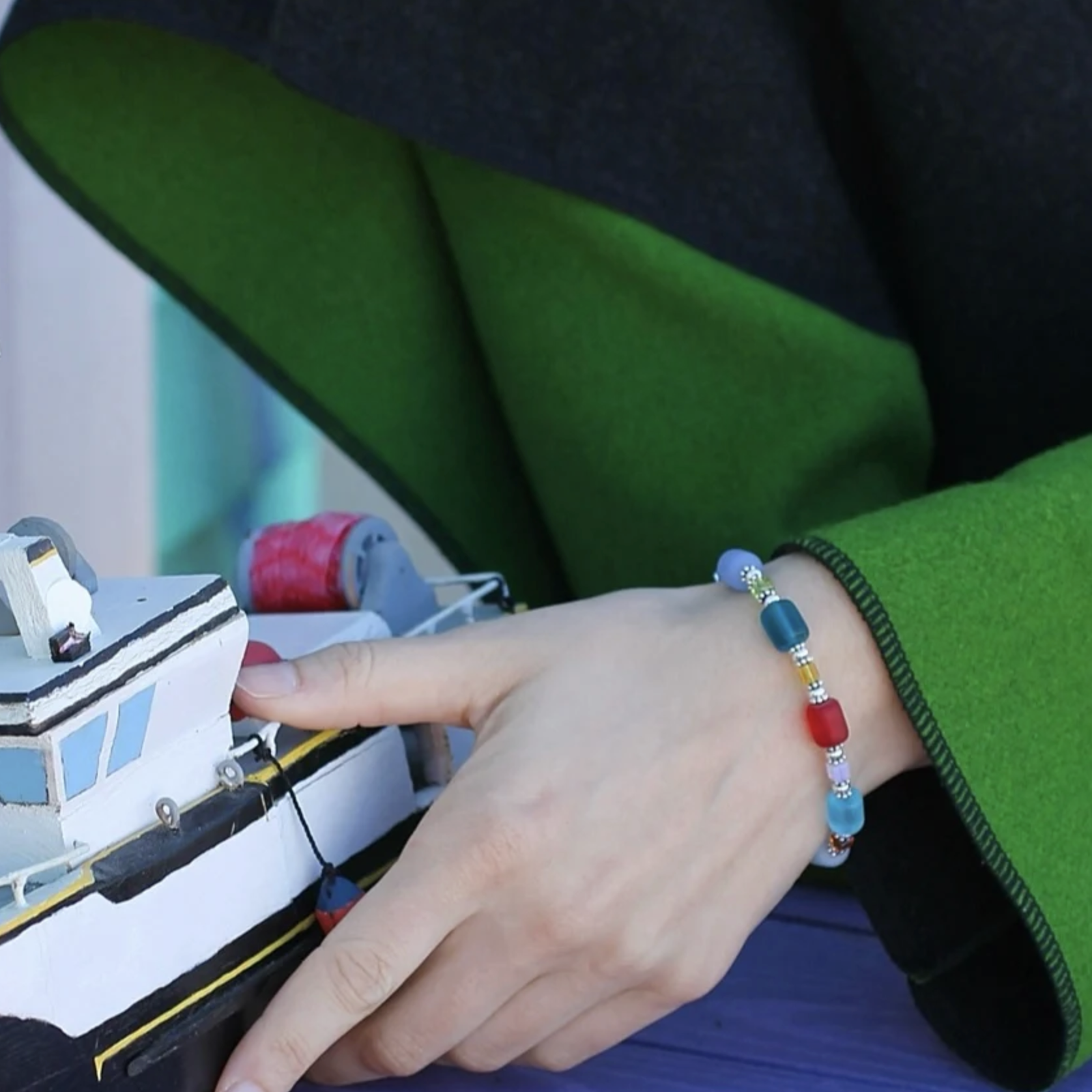 We have "blinged" up our Jelly Bean Row design a little to add just enough sparkle to this very popular design. The cultured sea glass paired with cubed Swarovski crystals will take you from day to night in this fun to wear design.