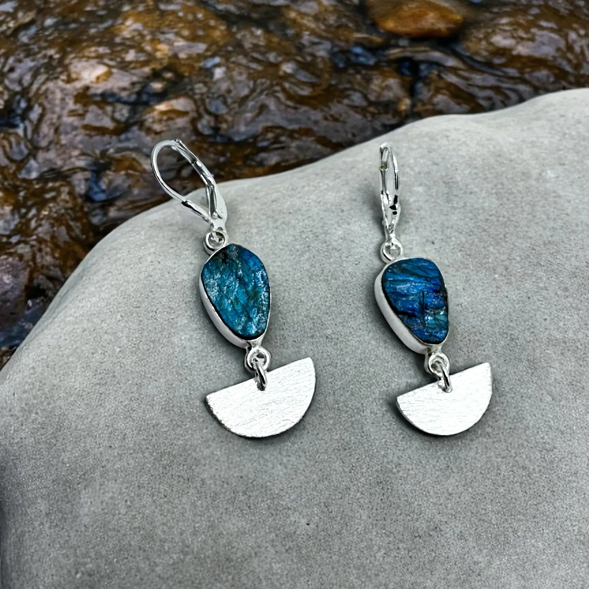 These stunning earrings will elevate your elevate your fashion game. They feature a raw AAA+ Labradorite bezel set stone in .925 sterling silver that shimmer as they catch the light. The sophisticated silver 1/2 moon elements creates a sense of movement and allure. Each piece is securely finished with a reliable lever-back ear wire, ensuring comfort and stability throughout the day.