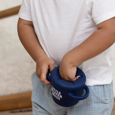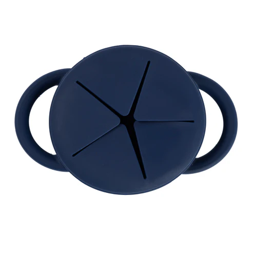 • The Happy Snacker is a first-of-its-kind two-piece silicone snack cup with a mess-proof snap-tight lid and soft silicone opening so little hands can easily access food and prevent spills. Designed with easy-grip handles, it fits in car seats and stroller cup holders.