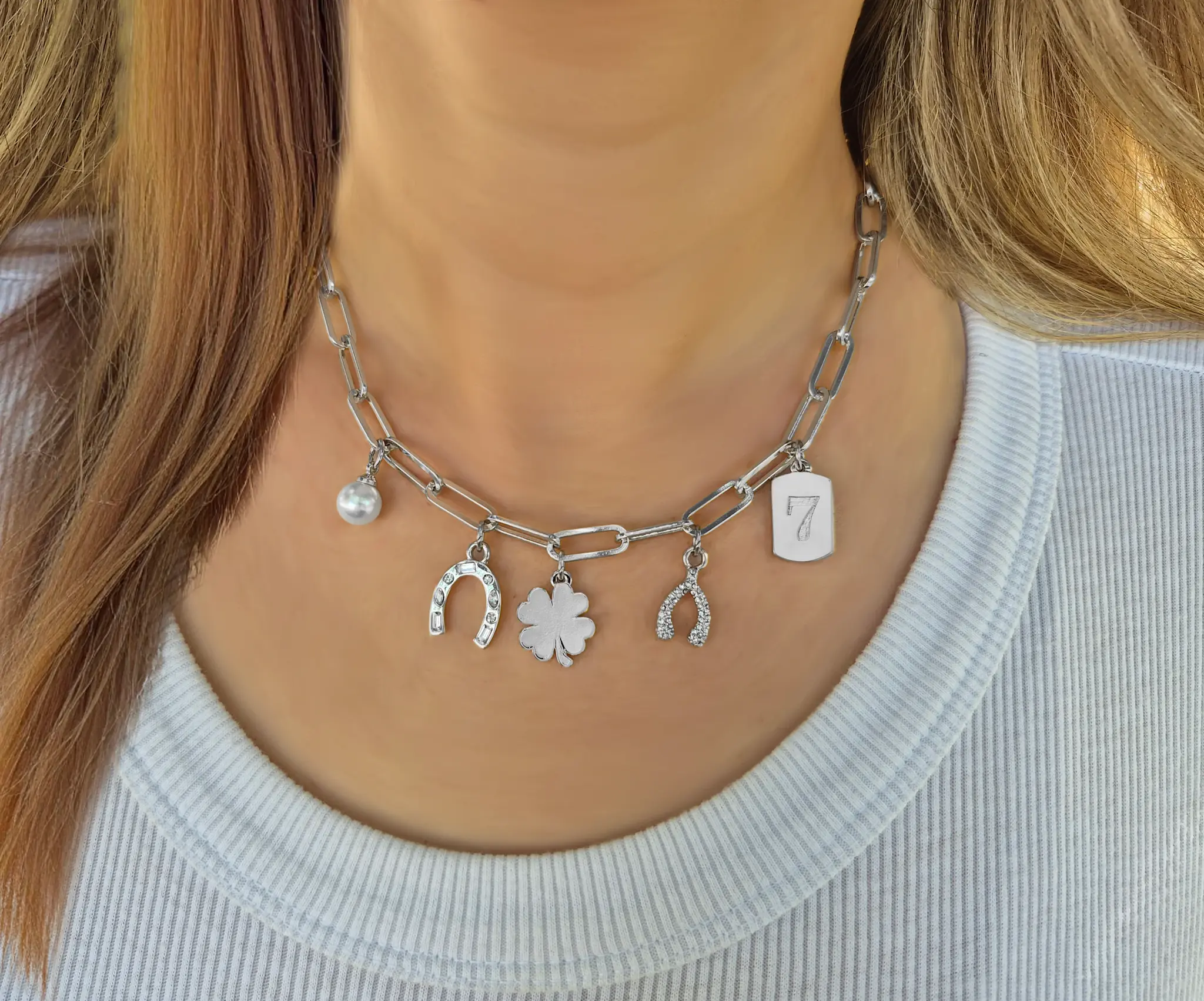 • Elevate your look with the Lucky Charm Necklace. Featuring 5 beautiful charms: a shamrock, a pavet-studded wishbone, a pavet-studded horseshoe, a lucky number 7, and a delicate glass pearl. Available in Gold and Silver.