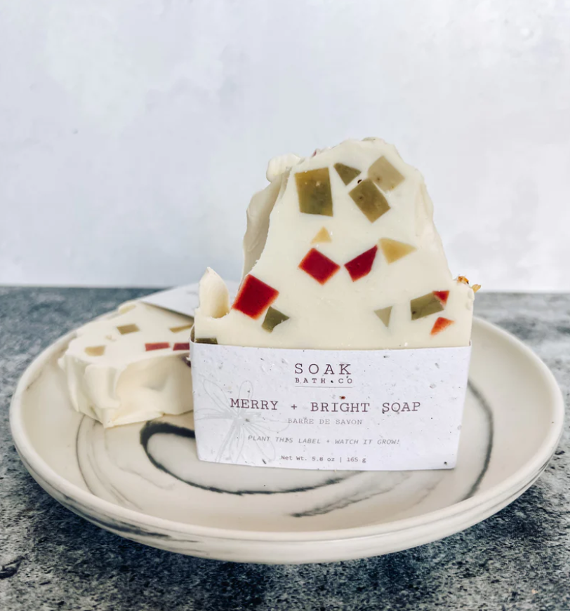 The Merry and Bright Soap bar is inspired by the sights, sounds and smells of the holiday season. Scented with Peppermint and Rosemary Essential Oils this soap bar captures minty notes with the herbal infusion of Rosemary to recreate the scents of walking through an evergreen forest. We’ve sprinkled in festive pops of berry and green to make this bar as merry as the season. Merry and Bright is a must have this holiday season!
