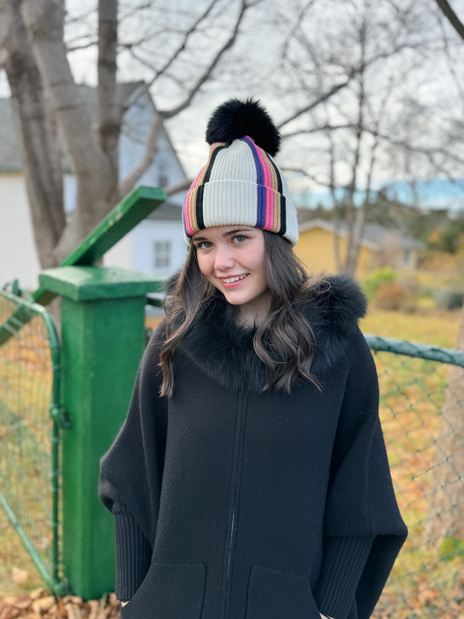 Stay warm with a wink of winter fun. This modern striped hat features cheerful stripes and a fluffy fox pom that adds just the right touch of playful charm.