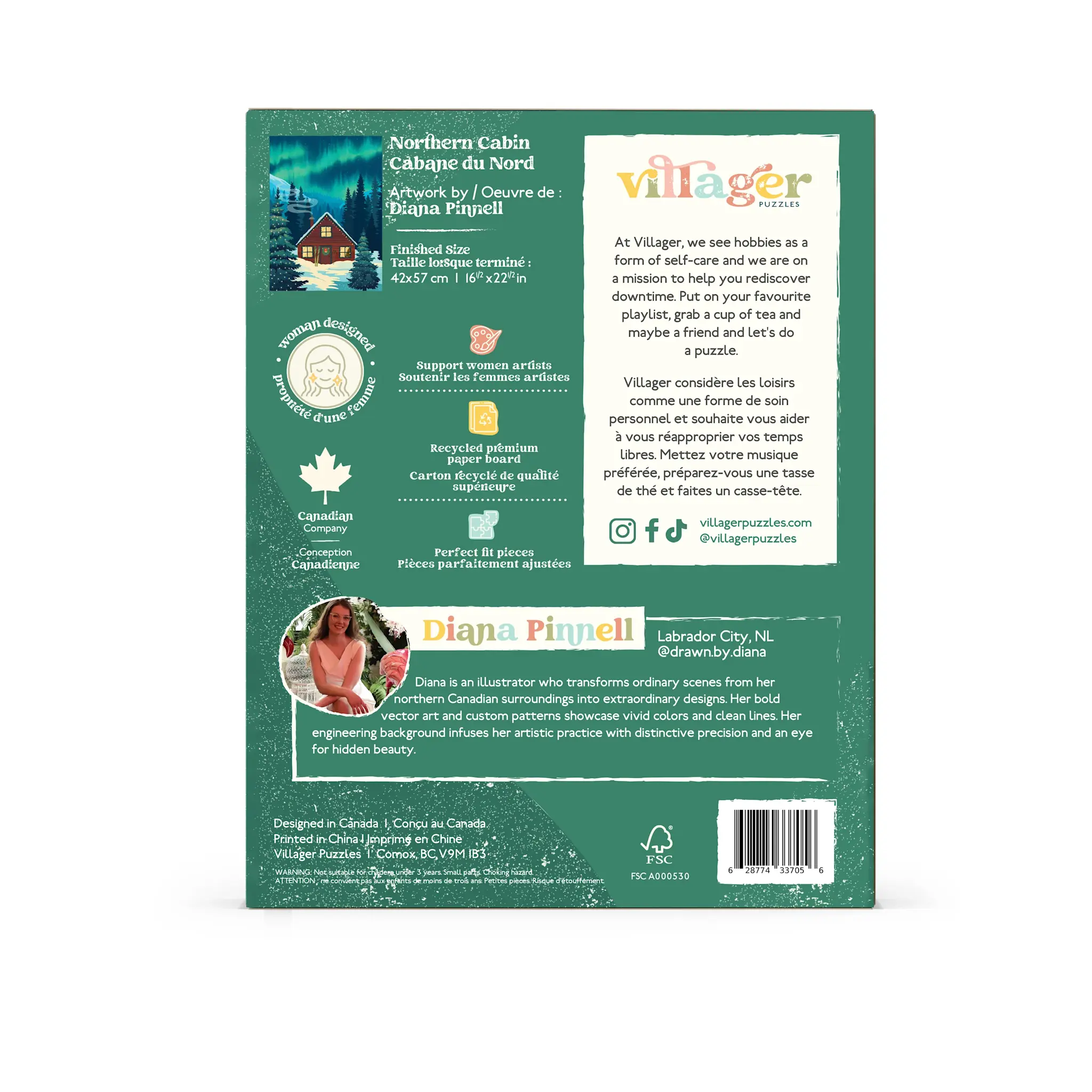 This enchanting puzzle depicts a cozy cabin nestled in the snowy woods, its chimney smoke curling into the night sky as the northern lights dance above. Evergreen trees sparkle with Christmas twinkle lights, casting a festive glow across the winter landscape. Designed by Newfoundland artist Diana Pinnell, the artwork captures the magic of a peaceful holiday retreat in nature, celebrating comfort, wonder, and the beauty of a Canadian Christmas in the north.