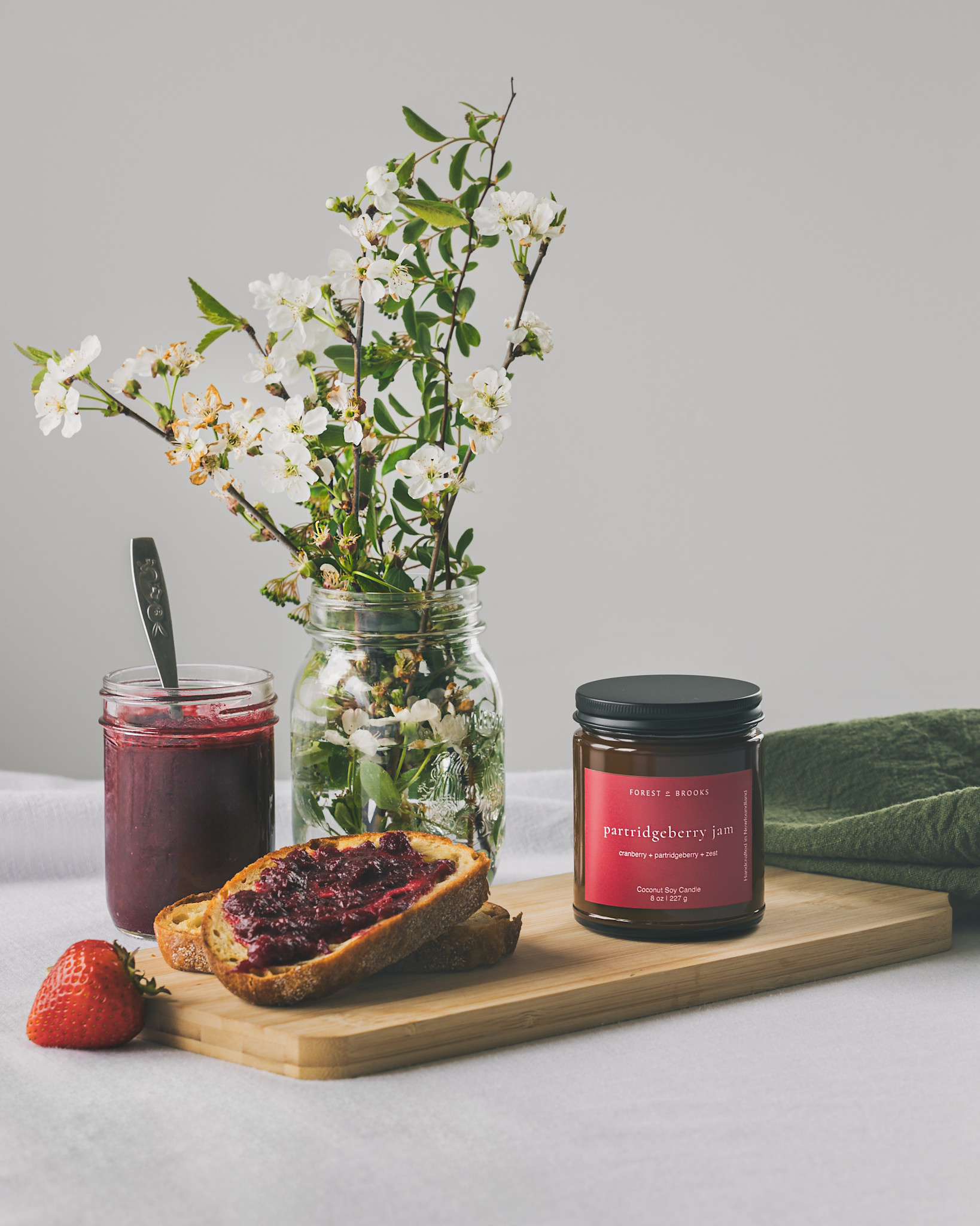 A wonderful blend that is sweet & tart. The tantalizing notes of fresh cranberry combined with wild partridgeberry, cassis, gardenia & tonka bean create a beautiful scent we call - partridgeberry jam.