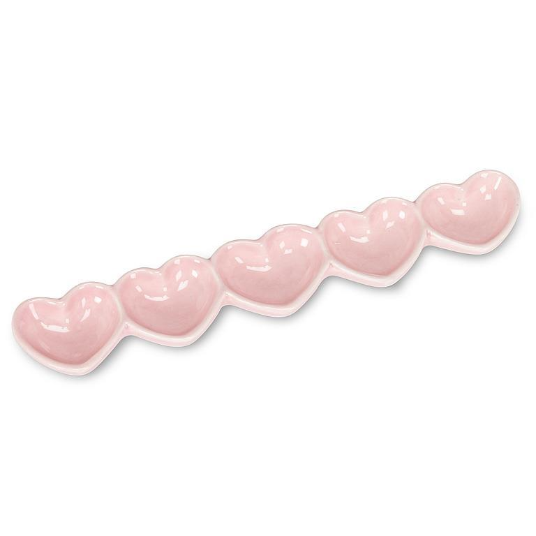 This ivory and pink ceramic tray brings five times the love. Use it to hold rings, serve treats, or dress up your vanity – it’s both sweet and functional, right down to the heart-shaped wells.Size: 9"LMaterial: CeramicColor: Ivory/Pink
