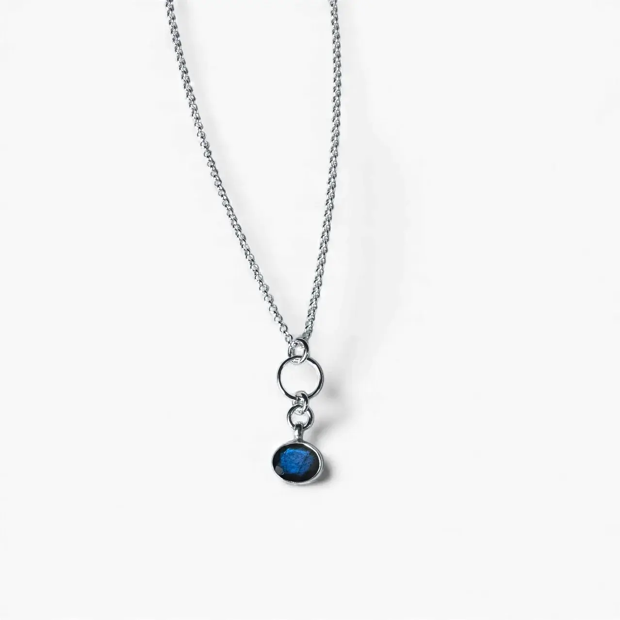The Rhyane necklace showcases a mesmerizing oval 9mm labradorite stone, expertly beveled and secured in sterling silver that reflects light beautifully with every turn. Its accompanying rolo chain combines refined aesthetics with reliable strength, making it equally suited for daily layering or statement-making moments. Labradorite's natural luminescence is said to have the Northern Lights trapped in the stone. Rhyane brings an understated sophistication to any ensemble, while the thoughtful design ensures this piece becomes a favorite.