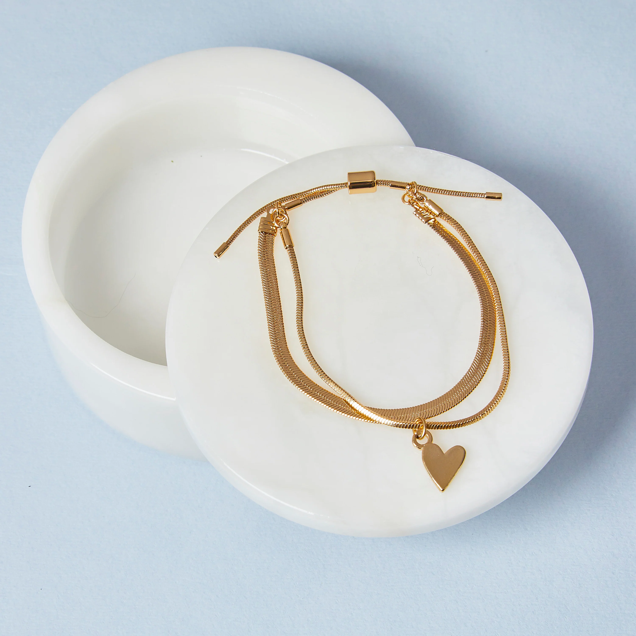 Looking to add some style to your wardrobe? This adjustable chain bracelet is the perfect touch. The snake chain and herringbone chains are accented with a heart-shaped charm. Available in Gold and Silver.