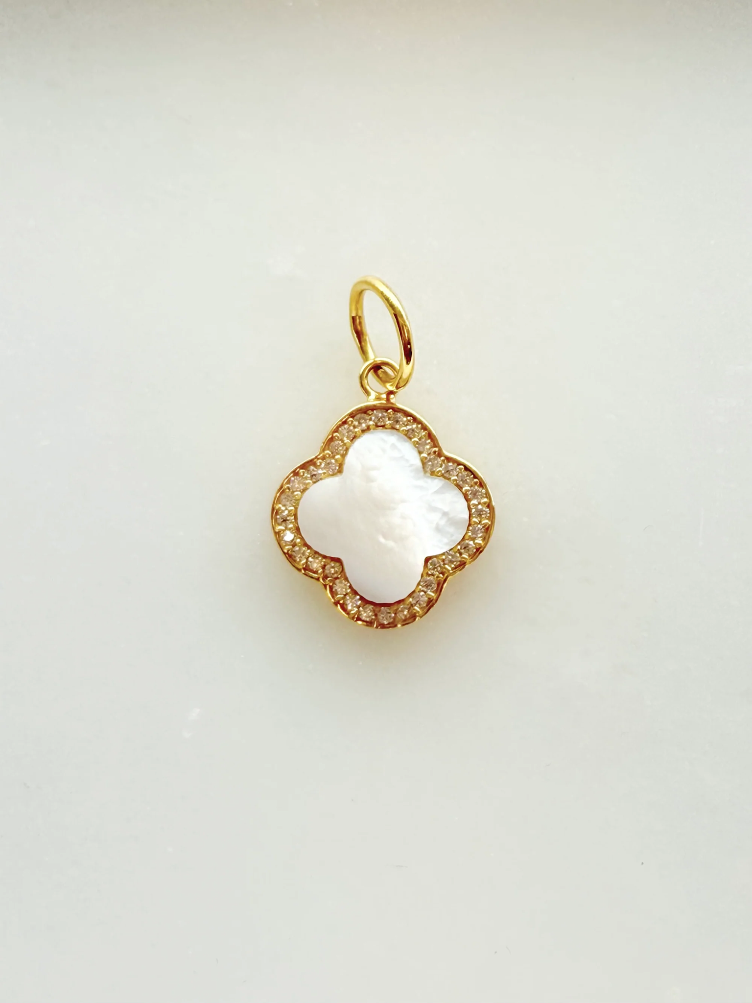 Flawless CZ stones are hand set one by one around the Mother of Pearl.