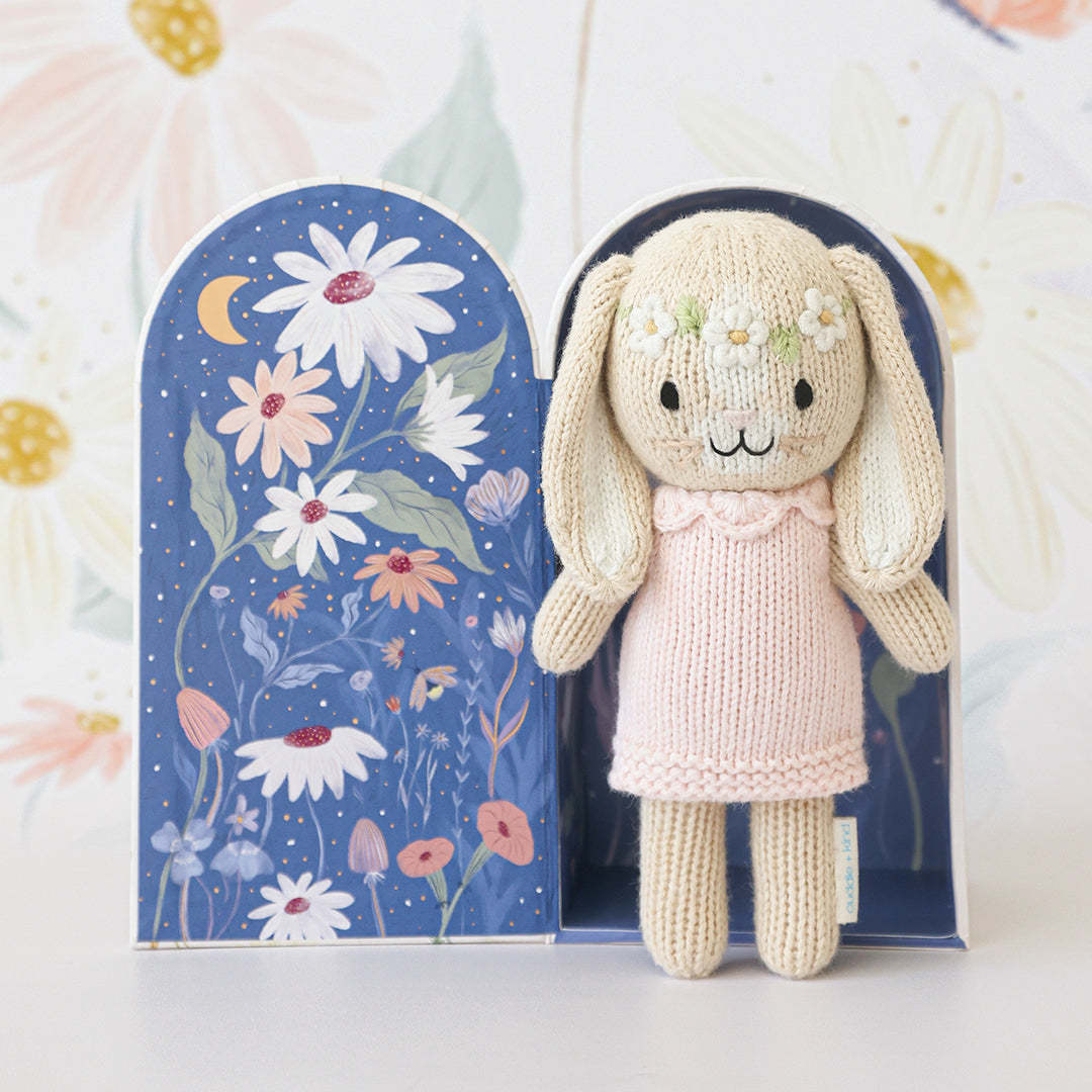 Each Tiny doll comes nestled in a Tiny home, with breathtakingly hand painted watercolour wildflowers and an antiqued bronze door knob that opens to a magical night scene full of twinkling copper foil stars. Collect the entire collection to create a beautiful enchanted meadow!