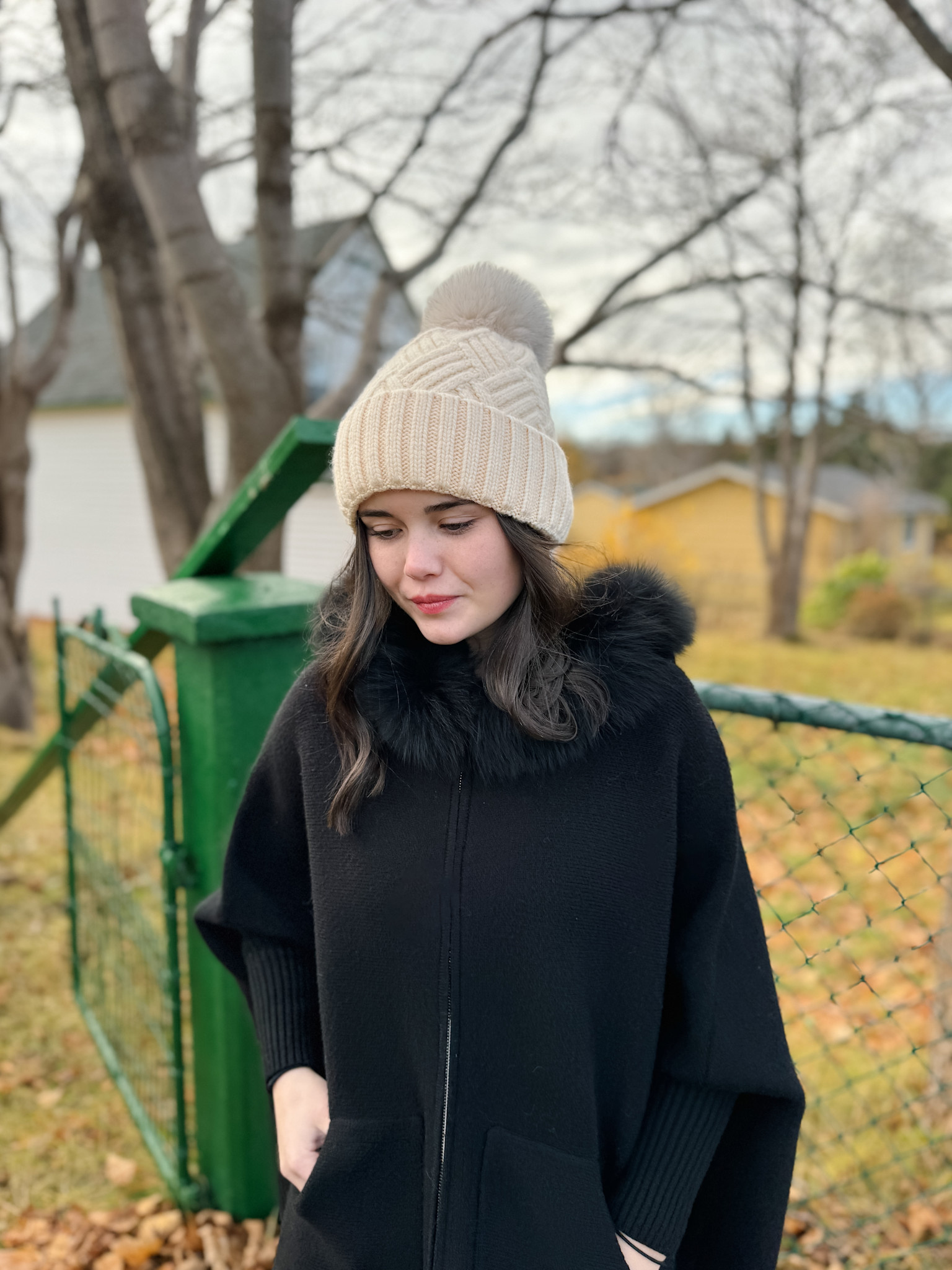 A soft woven knit topped with a bouncy fox pom, giving you warmth with a playful finish. Easy to wear and adorable for every winter outing.